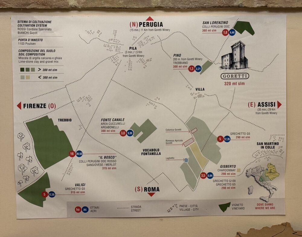 Nel 1963 la famiglia Goretti ha acquistato una tenuta sulle colline alle porte di Perugia e che si sviluppa intorno ad una torre trecentesca; la tenuta, estesa oltre i 40 ettari, ricade della denominazione dei Colli Perugini e, per i vitigni a bacca bianca, la produzione più importante è senz’altro legata al grechetto.