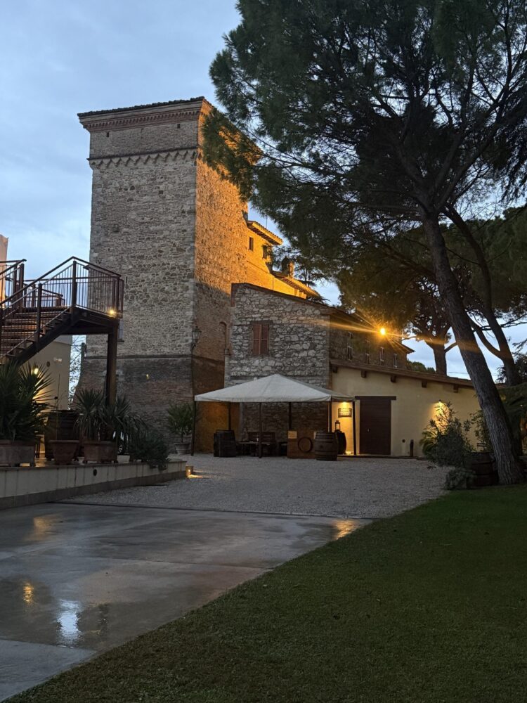 La bellezza dei luoghi non è solo estetica. È sostanza, radice e direzione. Nella Sala Marcella, dedicata alla nonna che ha trasmesso alle nuove generazioni l’arte dell’accoglienza, il vino incontra la cucina: corsi, cene, momenti di condivisione che trasformano la visita in esperienza. Nella Grotta di affinamento, scavata nella pietra, il tempo si misura in silenzi e profumi, mentre le bottiglie riposano come reliquie di pazienza. E poi c’è l’elisuperficie adiacente alla Torre, segno della vocazione contemporanea della famiglia Goretti: permettere a chi arriva da lontano di vivere un Wine Tour d’eccellenza, in un luogo dove tradizione e modernità convivono senza attrito.