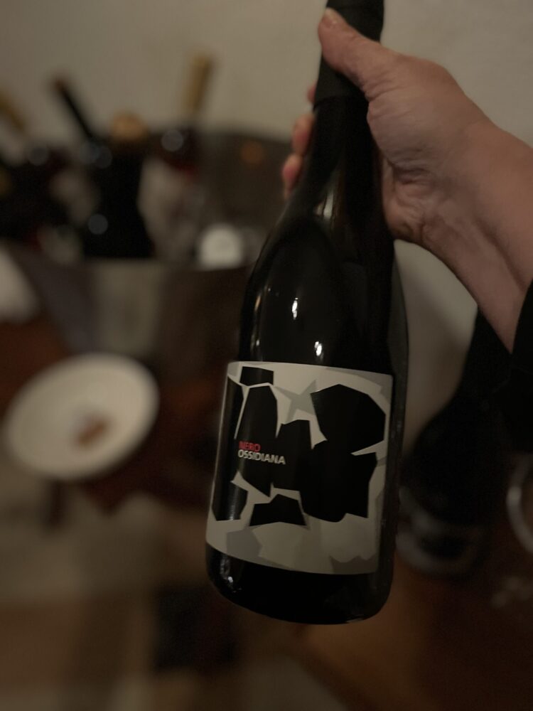 Nero Ossidiana 2021 da vitigno Corinto Nero con una piccolissima percentuale di Nero d’Avolacoltivata ad alberello. Alcuni grappoli rimangono interi non diraspati durante la vinificazione e poi dopo la svinatura il vino viene messo in botti usate per la malolattica, dopo otto mesi viene messo in acciaio, seguono 12 mesi di bottiglia. Profumo netto di marasca e spezie e note marine lo rendono suadente, mentre in bocca risulta fresco e minerale con una discreta lunghezza.