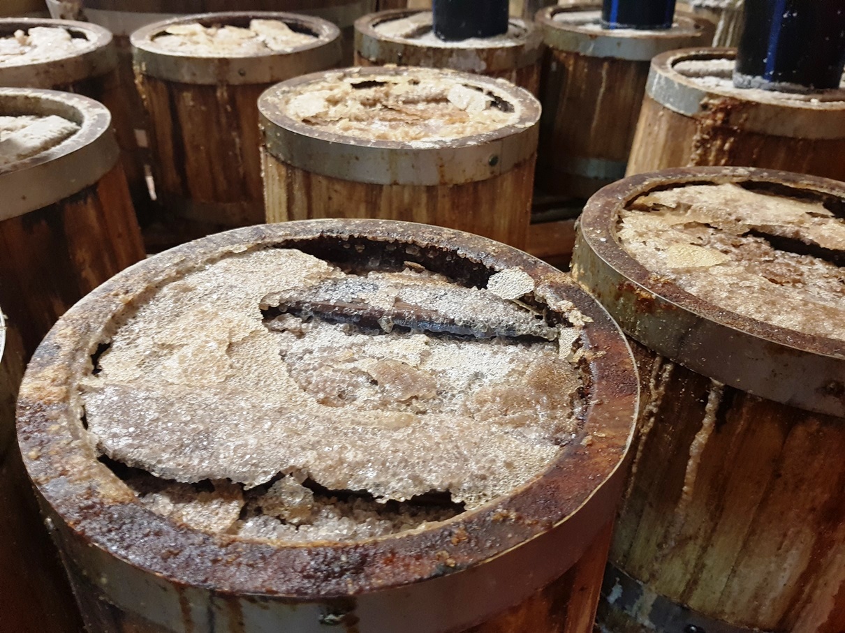 Con Lucia entriamo nel “caveau” dove, anticipati da una distesa di contenitori in cui dimorano le alici sotto sale in attesa di maturare e diventare filetti sott’olio, arriviamo alle botticelle in cui fermentano le alici, da cui si spillerà la Colatura. L’odore è forte ed intenso. Percorrendo questo piccolo sentiero del gusto si ha l’impressione di camminare nel tempo immutato delle nostre millenarie tradizioni gastronomiche.