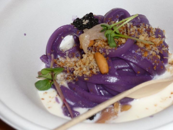 Intanto Aprea dà il “la” sottolineando l’importanza della materia pasta in sé stessa, scissa da salse e sughi. Pasta non pasta il tema di Andrea. Si parte con un piatto molto elegante, sinuoso: la pasta in abito da sera: linguine preparate con estratto di cavolo rosso, su burrata, crescione, pinoli tostati e aringa affumicato. Bellissimo da vedere, direi glamour, complesso e ricco di significati all’assaggio; tante consistenze, tanti sapori, il dolce della burrata, l’affumicato dell’aringa, il tostato del pinolo, l’amarostico del crescione e del cavolo nero. Andrea è un animale da palcoscenico, ormai, si muove con gesti sicuri, senza, tuttavia, staccare mai i piedi da terra. L’estetica è un elemento molto importante nella sua cucina.