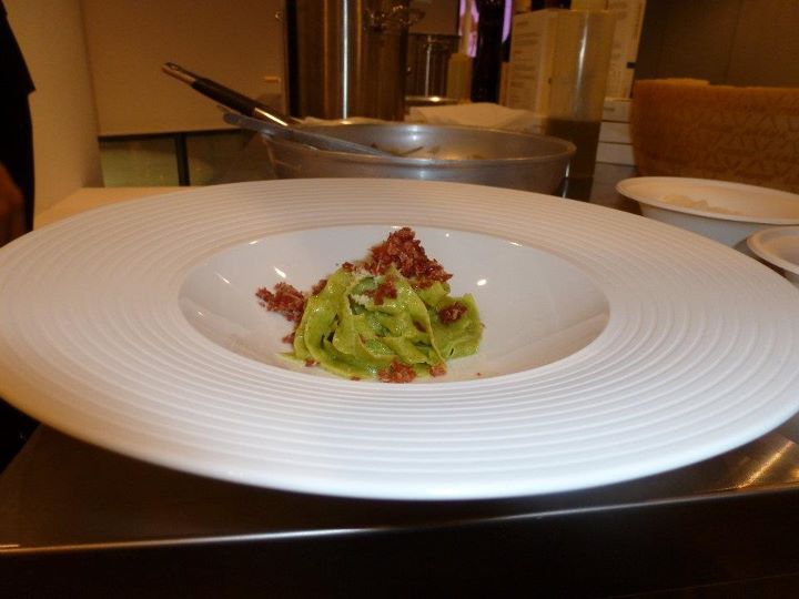 Il risultato è raggiunto, il piatto è equilibrato, ricorda sapori e profumi della versione tradizionale, varia la consistenza, più cremosa e se vogliamo, seducente per il palato. Il secondo piatto resta nel solco delle materie tradizionali e di territorio, stravolgendo del tutto aspetto, colori degli ingredienti e consistenze. Sposìto ha preparato in anticipo un impasto di farina e 30% di polvere di piselli disidratata, il composto viene ridotto in tagliolini, intanto in padella vanno scalogno e olio, e a finitura del piatto, grana e trito di prosciutto di Pietraroja.