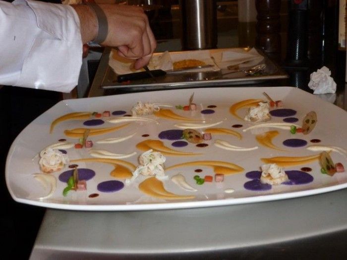 Le sue pianificazioni ed i suoi spostamenti seguono tempi lunghi, progetti chiari, lo chef napoletano sa bene dove vuole andare. Si parla anche con Eleonora Cozzella che ha brillantemente condotto il palco, del fatto che la grande ristorazione italiana, non riesce a varcare i nostri confini e che, purtroppo, lo stereotipo del mangiare italiano all’estero è ancora a livelli molto bassi. Positiva invece la tendenza nelle metropoli in Italia, Roma e Milano in prima fila, a sorpassare il clichè che l’alta ristorazione non possa sperimentarsi nei grandi hotel di lusso. L’altro piatto si sposta decisamente verso l’innovazione, sfoglie di pasta di rapa tirate con uno speciale strumento giapponese a formare dei piccoli cannelloni, da farcire con ricotta di bufala e consommé di scampi freddo.