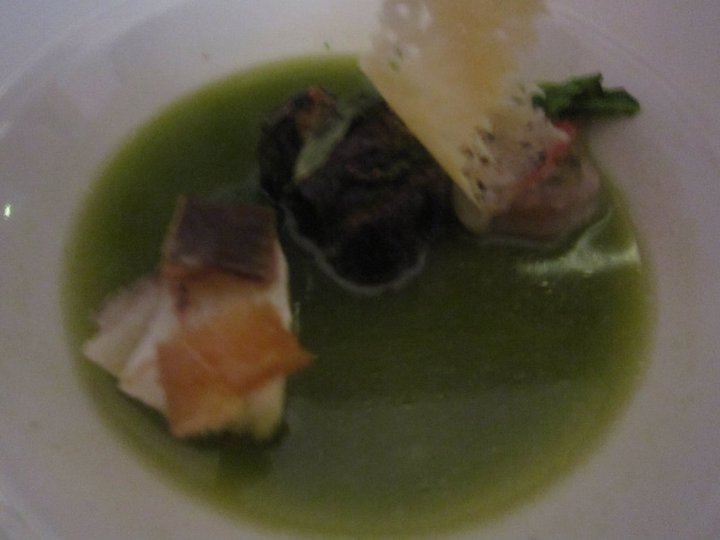 Il terzo piatto, abbozzato velocemente, è il piatto del mistero , a base di pesce e ortaggi, tutto cotto a bassa temepratura  e poi  calato in brodo di mela annurca, cipollotto nocerino e anice stellato, il   tutto su un piatto bianco, davvero non si capisce a vista cosa si ha nel piatto,  bisogna allertare olfatto e gusto e perchè no? Tatto per le consistenze e immaginazione, perchè la foto non c’è:)
