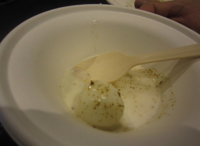 a Roma, continua Colonna, i cinesi imperversano, difficile raccontare loro un piatto come il cacio e pepe, allora ci siamo inventati qualcosa più vicina alla loro cultura, Una pallina di acqua e farina di riso farcita di cacio e pepe e poi bollita come la pasta e condita allo stesso modo. Il risultato è oltremodo originale, poco convincente per i “romani de Roma” e anche per noi.