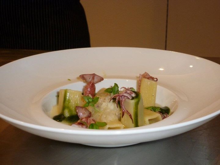 Il secondo piatto è una reinterpretazione della cucina materna: Pasta, patate, basilico e pecorino. Dalla memoria torna l’odore dell’ aglio dalla mamma nel soffritto, ed ecco l’aglio intero soffriggere fino alla doratura, parte del basilico viene centrifugato ed emulsionato con acqua minerale naturale; la pasta utilizzata è moderna, quadrata. Parte delle patate diventano crema insieme al pecorino toscano, piccoli pezzetti sono sparsi qui e là per dare sostanza. Una parte del basilico è messa da parte per guarnire dopo la mantecatura in padella, insieme a scaglie di pecorino romano più larghe. Si pensa che il piatto sia finito, e invece ecco spuntare minuscoli totanetti crudi, da appoggiare semplicemente sulla pasta fumante. Totani e patate= Costiera Amalfitana.