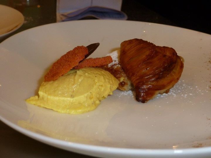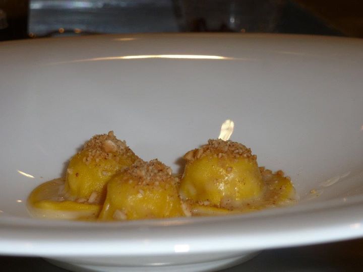 In questi spazi s’inserisce la creatività del cuoco. Tre i suoi piatti : il tuorlo d’uovo e cavolfiore in gioco di consistenze e forme, la polpetta di bollito, mirabile esperimento che trattiene l’umidità del bollito nel guscio fritto. Ed infine un richiamo alle varie anime, marina e terragna, una zuppetta di lumachine di mare e rarissimi fagioli dell’entroterra friulano.