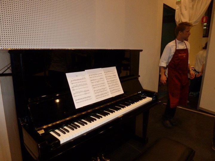 Intanto la perfomance esce fuori dagli schemi per due motivi: la preparazione del piatto linguine con quinto quarto di calamaro, viene preceduta da un video composto di pensieri, recitati da Marianna con un sottofondo musicale dal vivo: un tango;