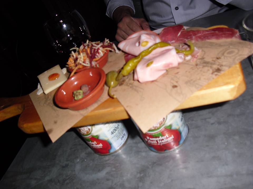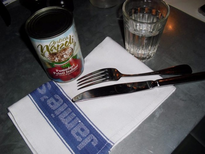 Il locale si presenta moderno, curato nei dettagli con qualche tocco di design che ricorda facilmente la cultura italiana. Ci sediamo: tavolo in metallo poggiato su muro di mattoni grezzi dai quali fuoriesce una lampada, metallo anch’essa, che illumina la tavola spoglia. All’improvviso arriva la cameriera che ci porta i menù e non solo. Arrivano a tavola 2 barattoli di pelati, chiusi. Io e Michele, il mio paziente compagno di avventure, ci guardiamo increduli ed iniziamo con le ipotesi: ci faranno provare un pelato così a crudo? No, forse si tratta di un souvenir o un segnaposto… decidiamo di attendere sperando di scoprirlo in fretta prima di chiedere… bastano pochi minuti per scoprire che invece i barattoli servivano come base d’appoggio per un tagliere di salumi e formaggi italiani.