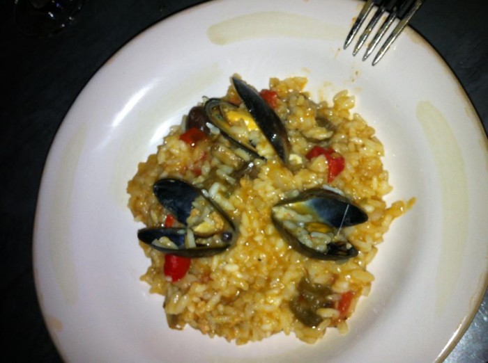 Non è difficile la scelta dei piatti, da buona campana rischio il tutto per tutto ordinando l’antipasto di salumi e formaggi tra i quali la mozzarella di bufala! Beh devo dire che all’inizio ho stentato a riconoscerla considerando che si presentava quasi come una mousse ma in realtà era soda ed era gustosa, certamente non potevamo aspettarci la mozzarella calda appena arrivata dal caseificio ma comunque non male, si trattava effettivamente di una mozzarella a differenza di formaggi freschi presentati all’estero come mozzarella forse solo per il colore bianco? Accanto alla mozzarella diversi salumi: prosciutto, mortadella, capicollo, certamente più facili da … esportare! Il mio amico non è da meno, tenta anche lui il colpo grosso: da buon pugliese sulla sua tavola non possono mancare le cozze, e cozze siano: risotto. Riso al dente, piatto equilibrato, forse appena un po’ salato, profumo di mare anche se non proprio quello di Taranto.
