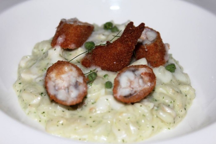 Meno riuscito il risotto per due motivi: uno, il solito, è la cottura eccessiva che si adegua ai gusti del cliente meridionale, l’altro è l’appesantimento eccessivo dell’alice fritta. In questo caso sarebbe stato preferibile alleggerire.