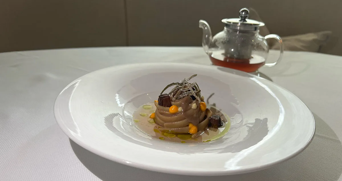 Disporre sul piatto l’olio al sedano e sopra di esso posizionare la pasta; aggiungere 6 spuntoni di purea di carote, 6 punti di salsa all’aglio arrosto, 4 cubi di brasato rosolato e alga kombu fritta. Concludere infine versando il dashi ai funghi tiepido sul fondo del piatto.