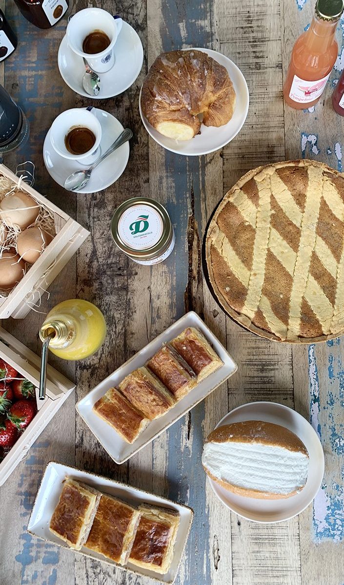 Presente anche il Cornetto all’Italiana da farcire con creme spalmabili al pistacchio o nocciola homemade e diverse pietanze salate prodotte con ingredienti provenienti dalle campagne circostanti: Club Sandwich rielaborato con i prodotti del territorio, Pastiera che introduce la primavera, Torta Parigina con impasto integrale e farcita con prosciutto cotto e formaggio a pasta filata, frittata di asparagi cotta al forno, uova sode provenienti da allevamenti all’aperto di Picinisco e le primissime fragole di Sermoneta, in abbinamento con succhi di frutta artigianali dei frutteti di Affile e centrifugati.