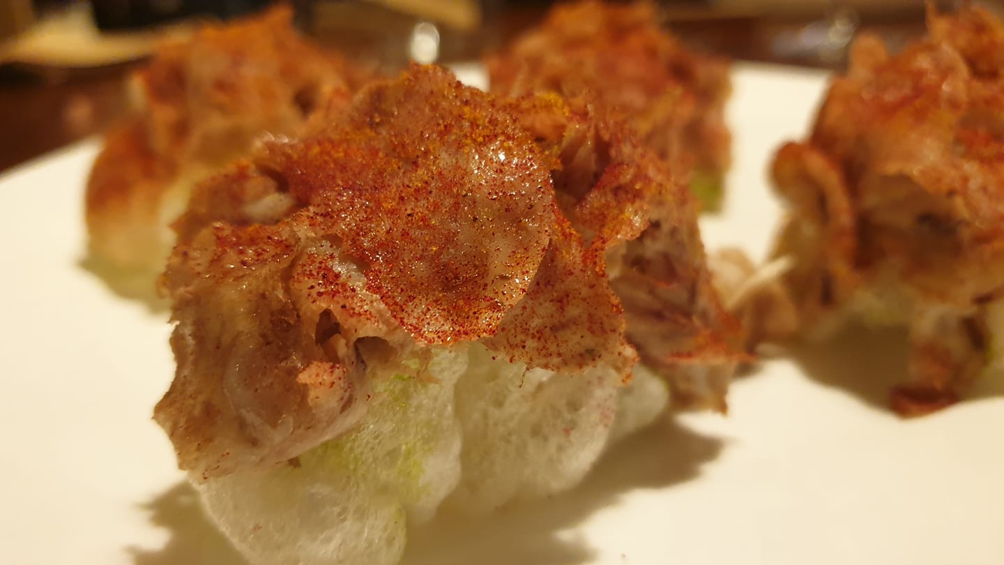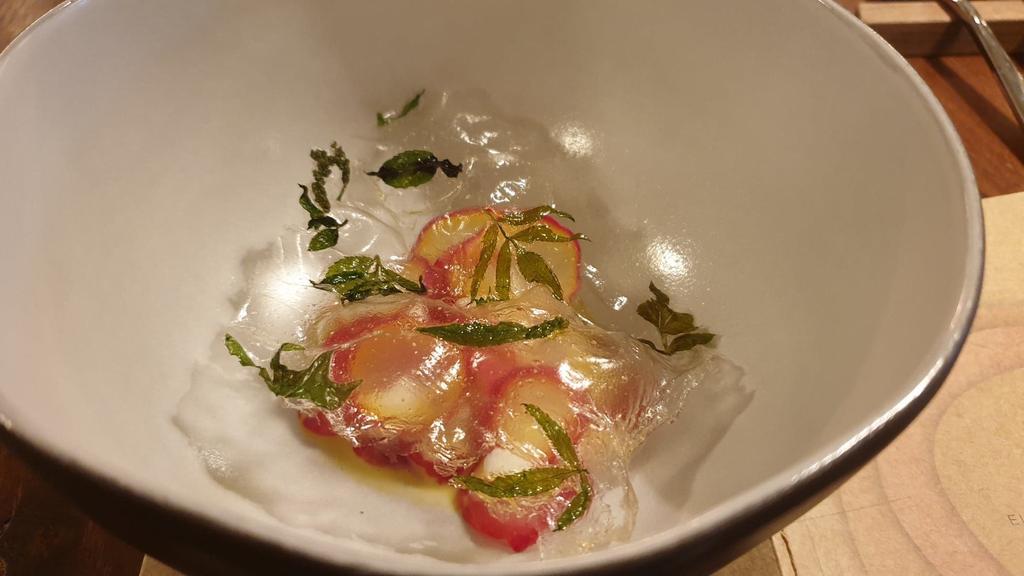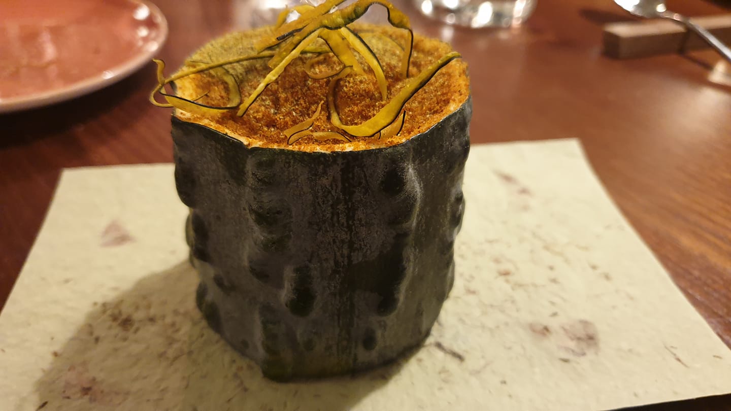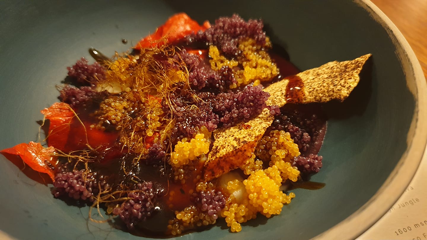 Un vero e proprio viaggio nel mondo del cacao, intenso, profondo, legato indissolubilmente alla propria terra d’origine. Una serie di assaggi onirici che raccontano la lunga storia del popolo peruviano con questa pianta. Un dolce – definirlo dolce forse è riduttivo – non dolce, diviso in più assaggi. Si usa tutto della cabossa: la buccia, i filamenti, i fiori, i semi, finanche la parte gelatinosa. La profondità dei toni acidi e amari è davvero notevole, si raggiungono sfumature davvero inusuali. Uno dei piatti più buoni provati negli anni. Qui l’alta cucina svolge in pieno il suo ruolo, che è quello di stimolare sì il palato, ma soprattutto la mente.