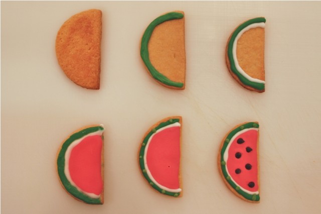 Con l’aiuto di un sac a poche o di un semplice cono di carta forno, traccia un semicerchio verde scuro. Poi un semicerchio bianco. Riempi il resto della superficie del biscotto con la glassa fucsia. Fai dei puntini con il verde chiaro sul semicerchio verde scuro. Adagia delle gocce di cioccolato sulla parte fucsia.
