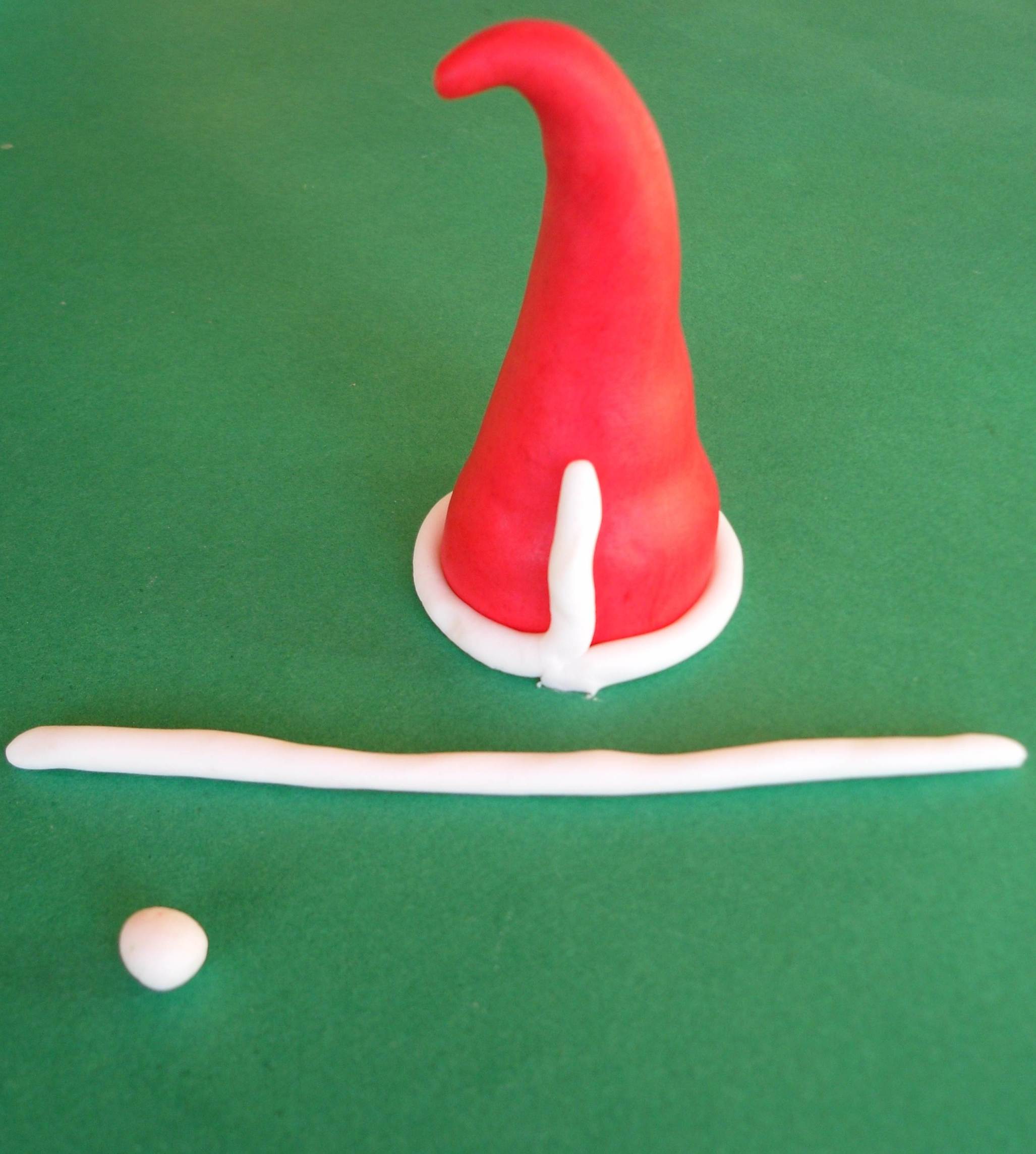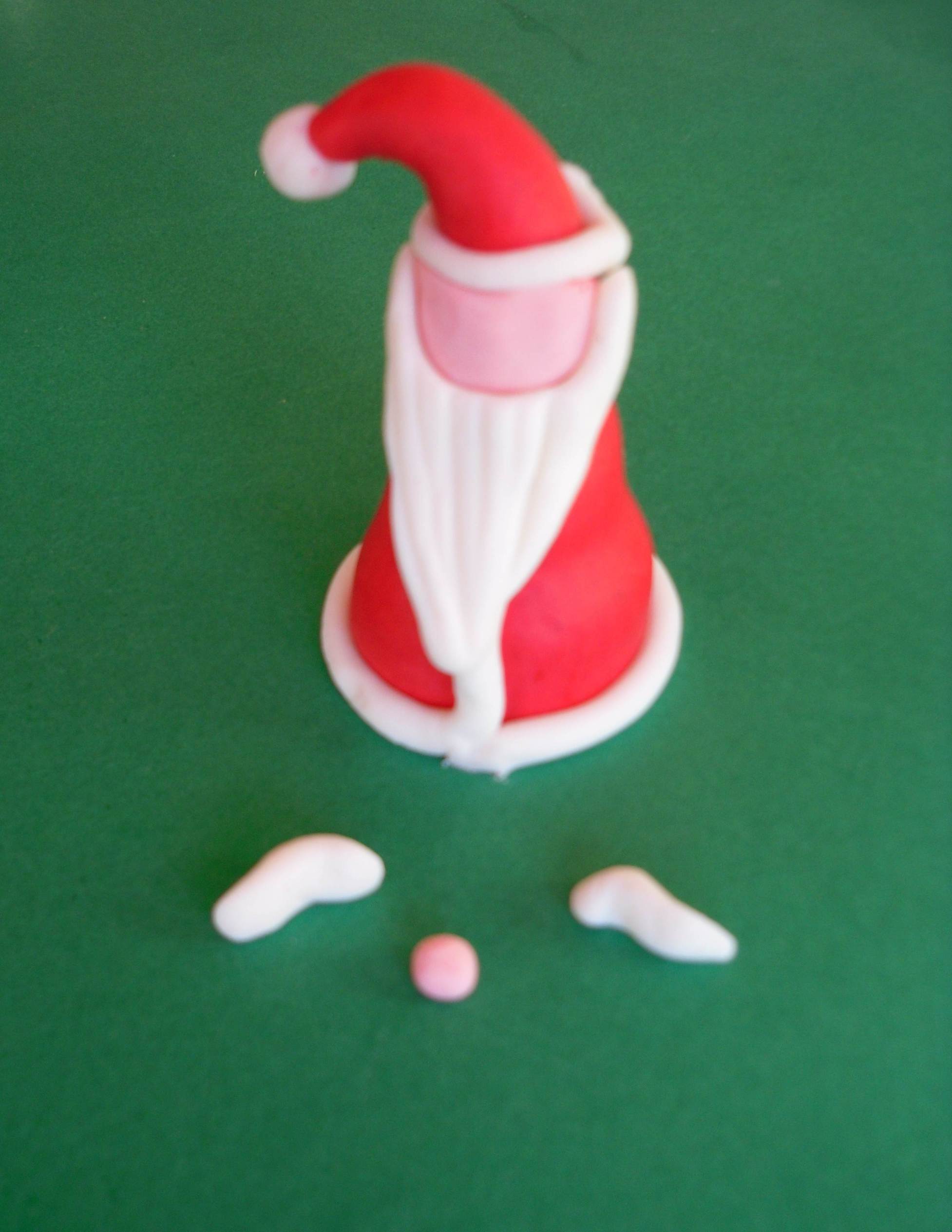 Creiamo i dettagli del viso. Modella una pallina di glassa rosa. Sciacciala e taglia l’estremità superiore. Forma una piccola pallina rosa per il naso. Crea un lungo triangolo (isoscele) di glassa bianca (barba). Pizzica le due estremità della base in modo da allungarle. Con un coltellino liscio, imprimi delle strisce verticali. Crea due piccoli cilindri bianchi e pizzicali al centro in modo da conferirgli una forma leggermente appuntita (baffi).