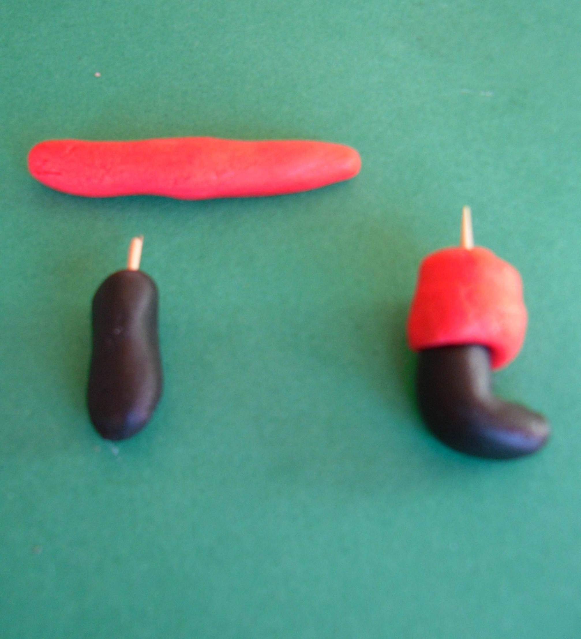 Modella due cilindi di glassa nera. Piegali come a formare una “L” in stampatello maiuscolo (stivali). Inserisci nell’estremità superiore, un pezzo di stuzzicadenti. Avvolgi la parte superiore di ogni stivale, con una striscia di glassa rossa (gamba). Fai asciugare almeno per un paio di ore.