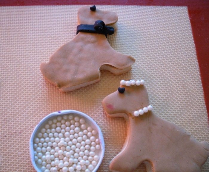 Prepara i biscotti di pastafrolla sagomandoli con il cutter a forma di cane. Stendi della glassa fondente, tagliala con lo stesso cutter e, dopo aver steso un velo di gelatina di albicocche sul biscotto (freddo), applicala delicatamente (sul biscotto).