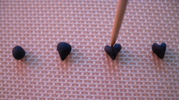 Per gli occhi, ho creato dei cuoricini molto piccoli. Se non hai lo stampino ad espulsione, puoi realizzare i cuoricini stringendo tra indice e pollice una piccola pallina di glassa fondente (in modo da ottenere la punta) e poi, con lo stuzzicadenti sagomare la parte superiore del cuore.