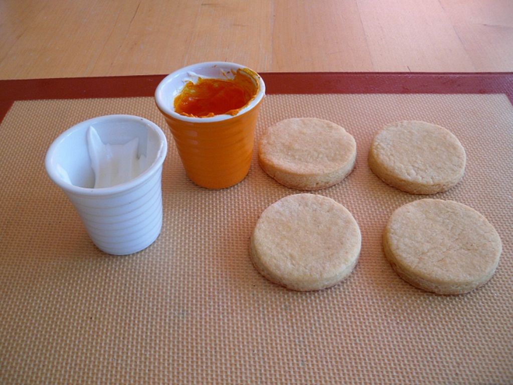 Con l’aiuto di un sac a poche o di un semplice cono di carta forno, traccia un cerchio di glassa arancione lungo il bordo del biscotto.Traccia un cerchio bianco, all’interno di quello arancione.