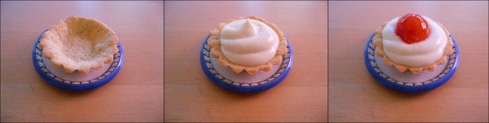 Riempi il cestino di pasta frolla con la crema di ricotta e adagia un pomodorino.