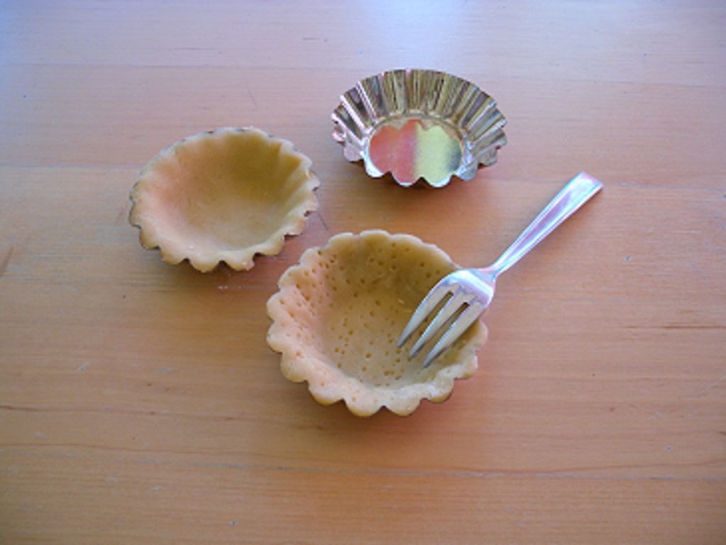 Stendi la pasta frolla e disponila negli stampini precedentemente imburrati. Punzecchia con i rebbi della forchetta. Inforna a 180° e cuoci per circa 10 minnuti. Sforna e fai raffreddare.