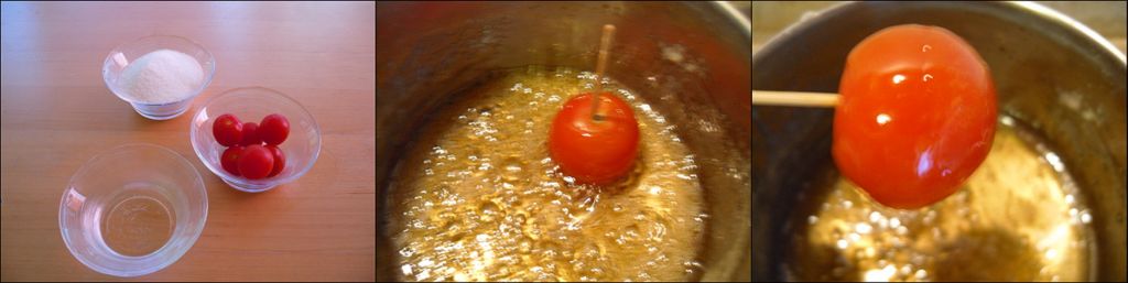 Versa lo zucchero e l’acqua in un pentolino antiaderente. Porta ad ebollizzione a fuoco lento fino ad ottenere un caramello bruno. Togli dal fuoco. Metti i pomodorini su degli stuzzicadenti e immergili rapidamente nel caramello. Fai asciugare.