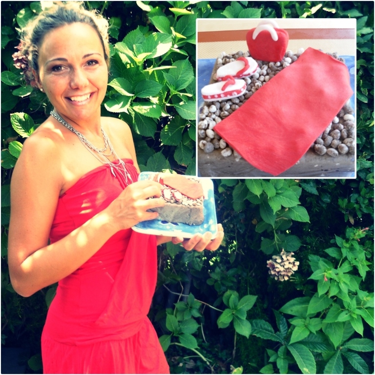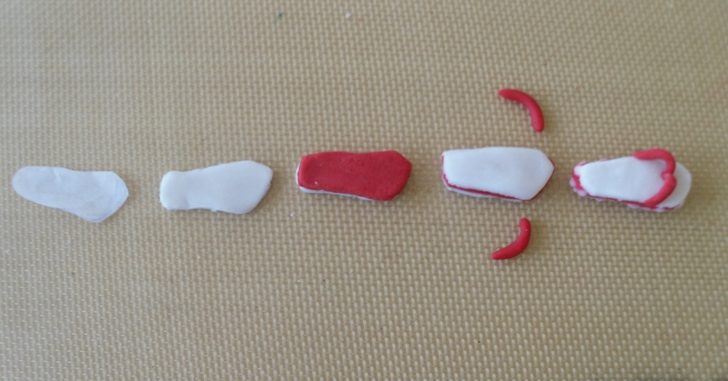 Disegna su carta forno di un infradito. Taglia la sagoma. Stendi della glassa fondente e, usando come guida la sagoma di carta forno, taglia un “infradito” di glassa. Io l’ho fatto di tre colori e con i pois quindi, ho ripetuto tre volte il procedimento, sovrapposto (e incollato) i vari strati, e fatto dei pois di glassa reale. Infine forma le stringhe curvando leggermente due piccoli cilindri di glassa , ed applicale sull’infradito così come in foto .