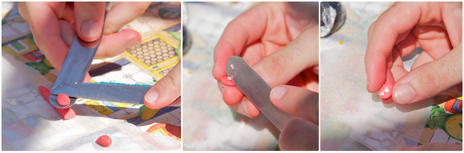 Partendo da palline di glassa di vari colori e dimensioni, crea un personaggio buffo, per il nostro picnic. La sequenza fotografica, illustra i vari step.