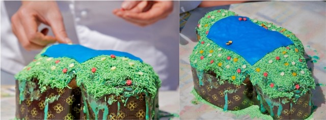 Distribuisci le scaglie di cioccolato verde in modo da ottenere il prato.