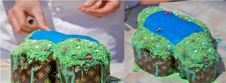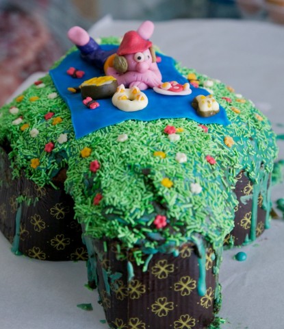 Non c’è cake designer che non si sia ispirata, almeno una volta nella sua carriera, alla torta “picnic” della Wilton. Questa volta tocca a me. Vi propongo, come decorazione della “triste” colomba, la mia versione del picnic “napoletano” di Pasquetta. Prato fiorito e menù tipico: “fellata” (affettati e uova sode), casatiello, pastiera e colomba, tutto eseguito rigorosamente con glassa reale e fondente.