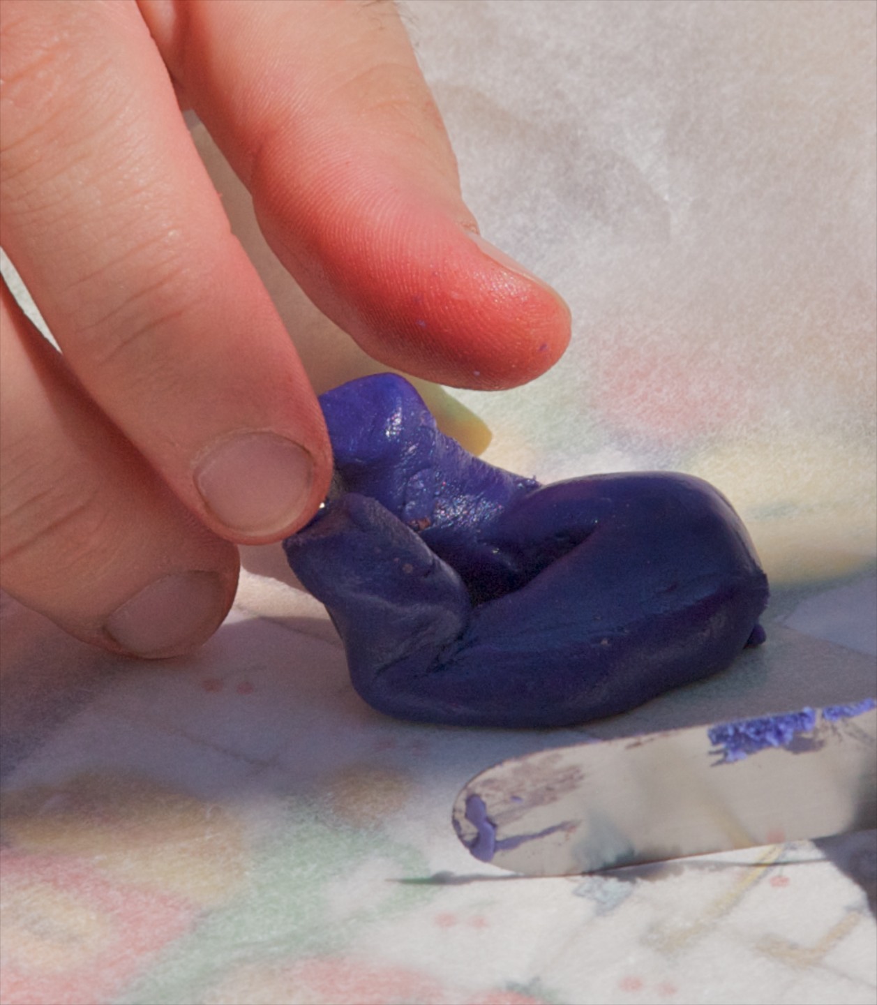 Sciaccia una pallina di glassa blu, taglia le due gambe e piegale all’insù.