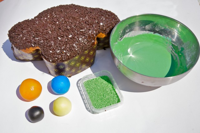 Il casatiello: fai una ciambella di glassa giallina. Applica delle palline arancioni (le uova) e ricopri ogni pallina con delle striscioline incrociate a mò di “x”.