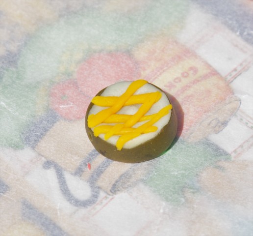 Per la pastiera fai un disco alto di glassa marrone. Disponi sulla superficie superiore un cerchio di glassa chiara e applica delle strisce di glassa gialla facendole incrociare.