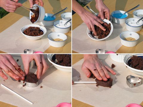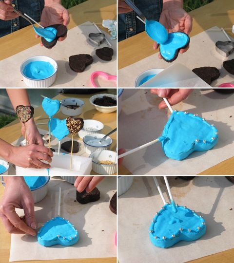 Dopo aver sbriciolato la torta (fredda), unisci la ganache e lavora bene il tutto. Su un foglio di carta forno, riempi con l’impasto un tagliabiscotti a forma di cuore. Premi bene ed elimina l’eccedenza. Rimuovi il taglia biscotti. Infila delicatamente il bastoncino del leccalecca oppure uno stecchino da spiedino. Fai riposare in frigo per almeno 3 ore.