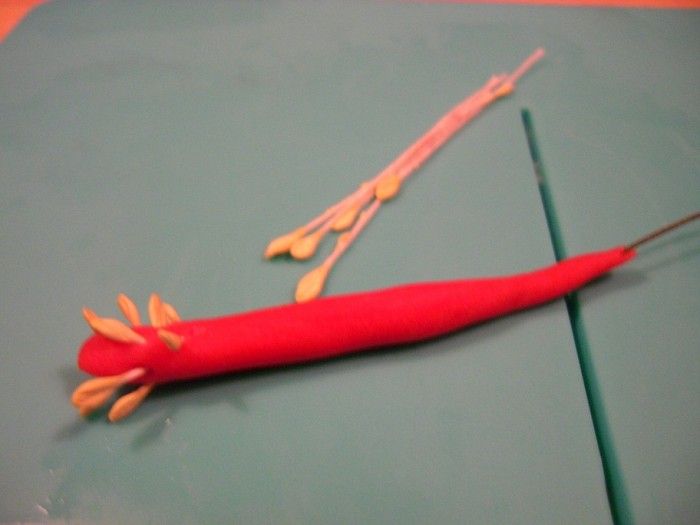 Applica dei pistilli gialli lungo l’estremità superiore del cilindro e dei pistilli rossi nella parte centrale della stessa.