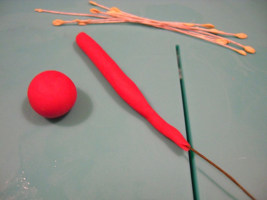 Partendo da una piccola pallina di gum paste, modella un cilindro. Intingi un ferretto da fiorista (wire #26) nella colla edibile ed insericilo nel cilindro.