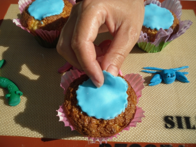 Adagia un disco di glassa sulla cup cake e termina poggiando i soggetti che hai realizzato!