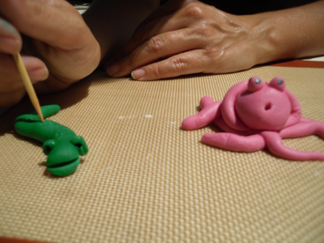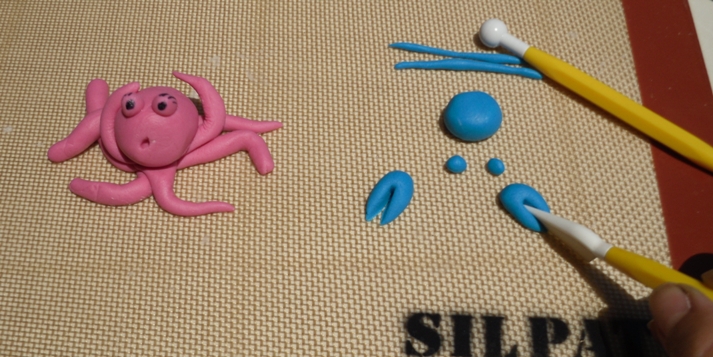 Per realizzare il granchio prepara con la glassa fondente due piccole palline, due cilindri sottili, due coni e una pallina schiacciata.