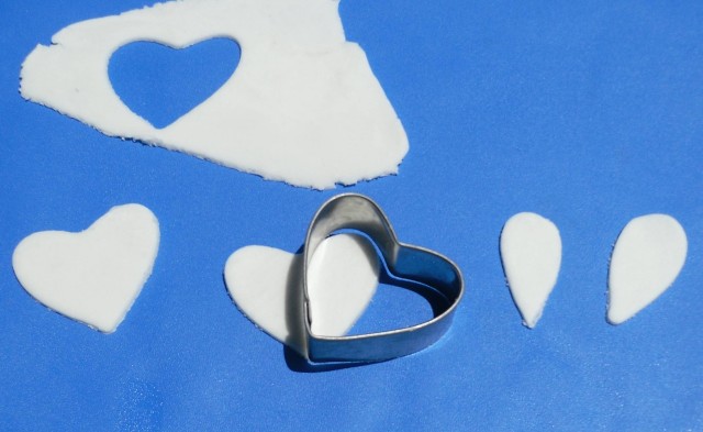 Stendi la gum paste o la glassa fondente. Taglia un cuore. Con lo stesso cutter, dividi il cuore in due parti in modo da ottenere due gocce. Per ogni fiore occorrono cinque petali.