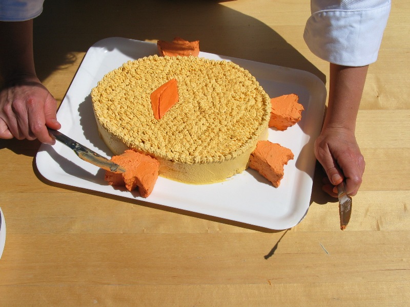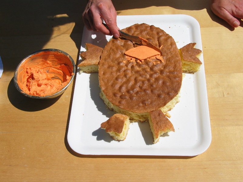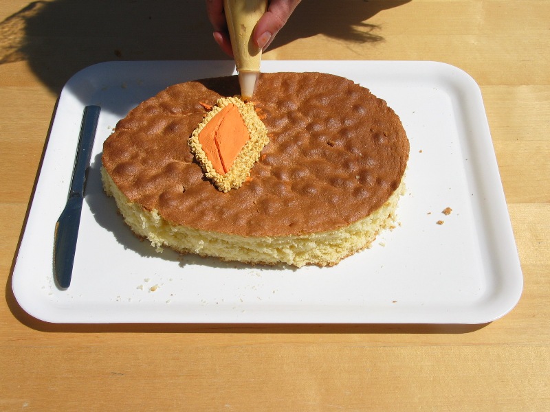 Con un coltello liscio o una spatolina, ricopri di panna gialla il bordo della torta (corpo del pulcino) e di panna arancione le zampette e le ali.