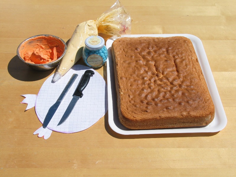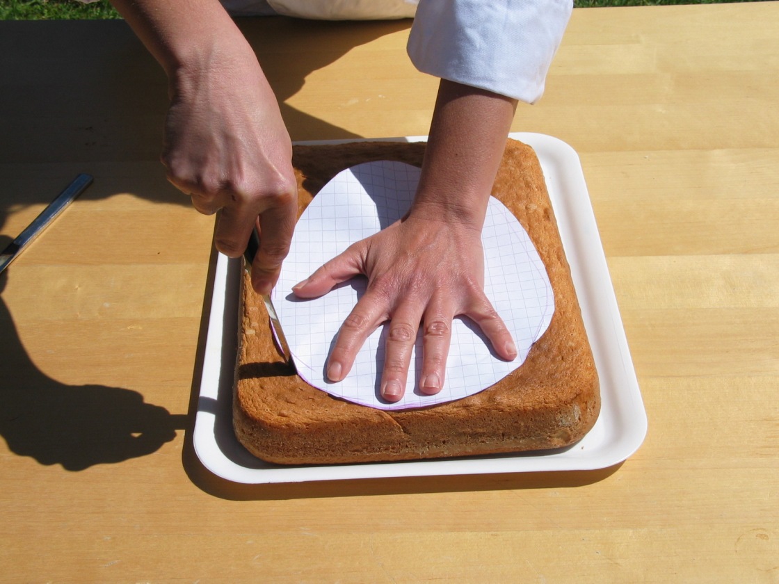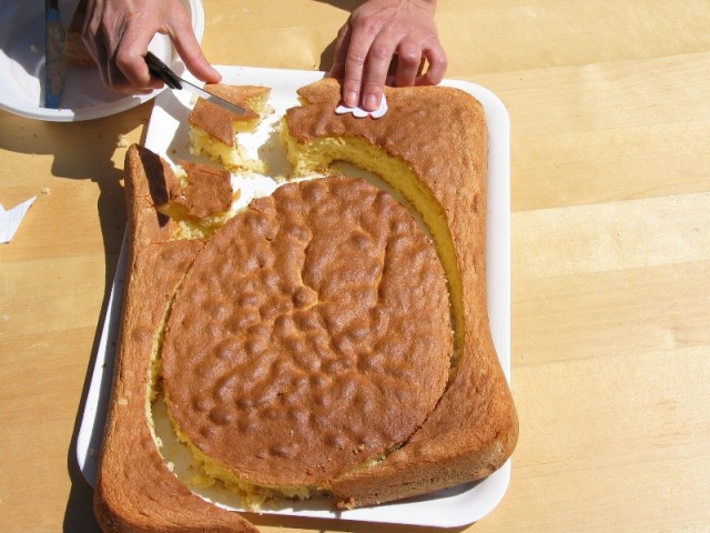 Poggia l’uovo sulla torta e taglia “il corpo” seguendo il contorno del disegno.