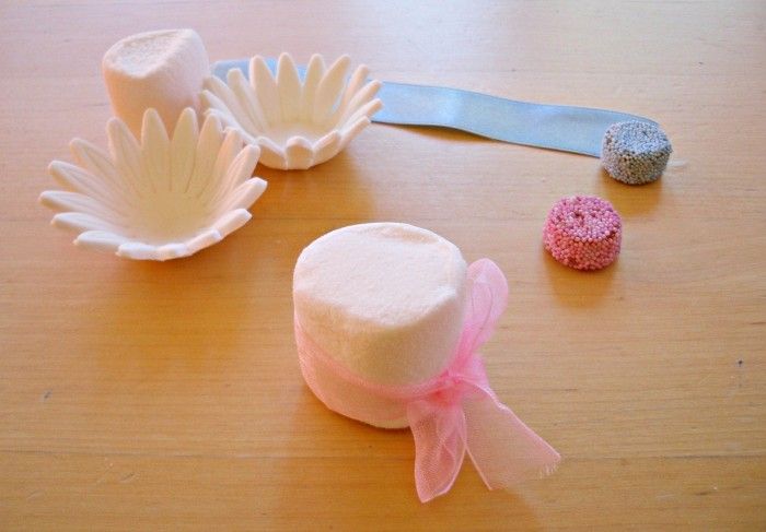 Cosa serve: marshmallow bianchi, nastri di raso o organza, caramelle rotonde dello stesso colore dei nastri, fiori bianchi di gum paste (o piccolo centrino di carta/pizzo/merletto).