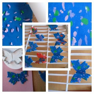 Per realizzare rapidamente delle farfalle colorate, stendi della pasta di zucchero e sbriciola su questa, della pasta di zucchero di altri colori. Schiaccia con il matterello ottenendo così un unico strato di pasta di zucchero con bellissime sfumature di colore. Taglia la farfalla con lo stampino ad espulsione. Premi lo stampino su una spugnetta. Metti ad asciugare la farfalla con le ali all’insù.