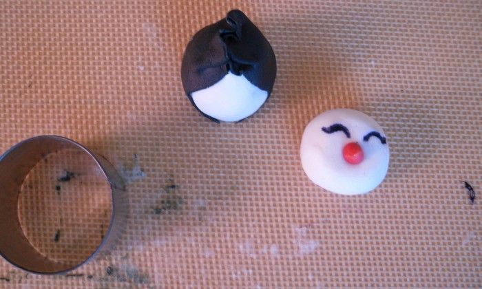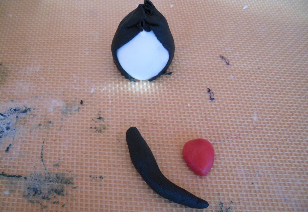 Stendi una striscia di glassa fondente nera. Con un cutter a forma di cuore, crea il contorno del viso del pinguino, così come in foto. Applica la glassa nera sulla pallina precedentemente inumidita, facendo aderire delicatamente. Rimuovi la glassa in eccesso.