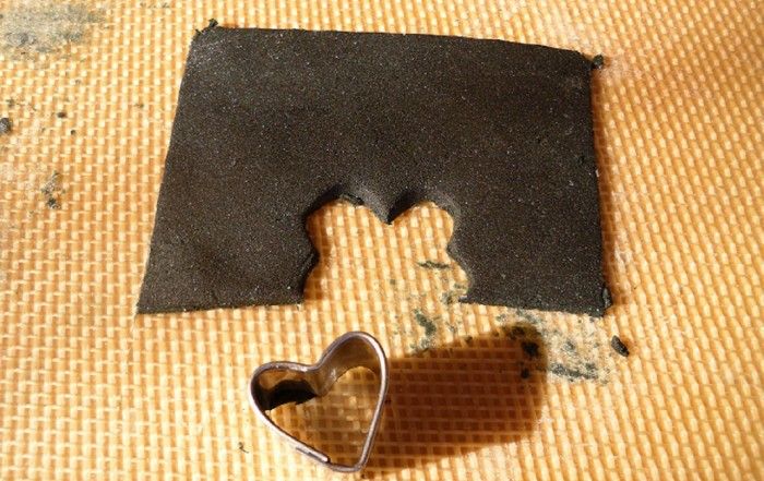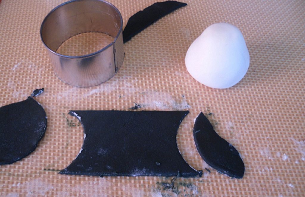 Stendi una striscia di glassa fondente nera e, con un cutter circolare, taglia i lati piccoli creando due archi.