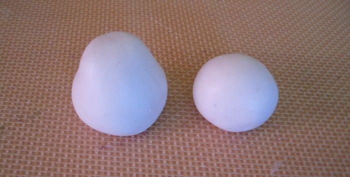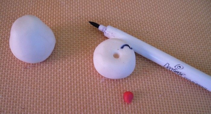 Modella la testa, schiacciando leggermente la pallina. Disegna gli occhi con un pennarello alimentare. Modella un piccolo cono arancione (becco). Con un bastoncino, fai una piccola fossetta, e applica il becco.