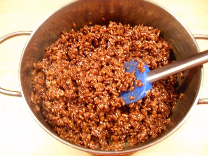 Sciogli burro e mars nel latte a fuoco lento. Spegni. Aggiungi il riso soffiato e mescola fino a far amalgamare il tutto.