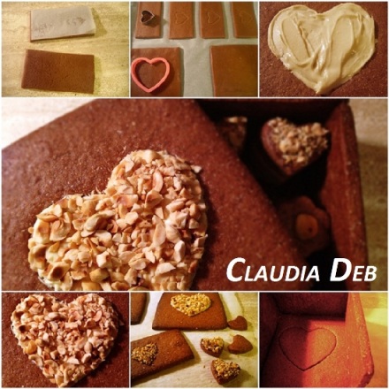Sciogli il cioccolato bianco a bagnomaria. Spalma sul cuore ottenuto su ciascun rettangolo e su uno dei due quadrati (sarà la parte superiore della scatola). Applica le nocciole tritate e fai asciugare.