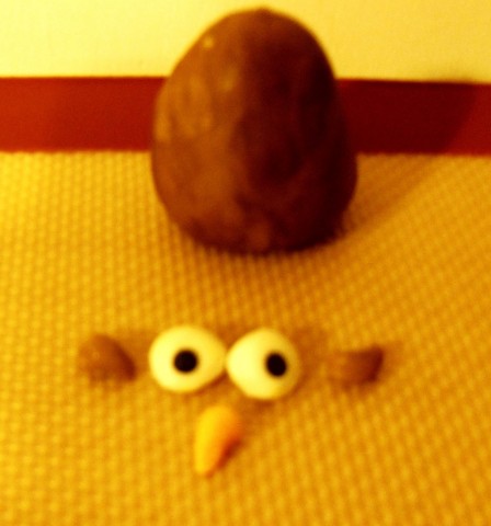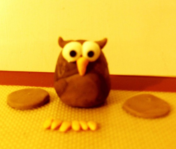 Modella una pallina di glassa fondente fino a conferirle la forma di un cono con la punta arrotondata. Crea due palline bianche con due puntini neri applicati al centro (occhi), un piccolo cono giallo leggermente curvo (per il becco) e due piccoli cilindri piegati all’insù (orecchie). Applica i dettagli del viso, inumidendoli con una goccia d’acqua per “incollarli”.